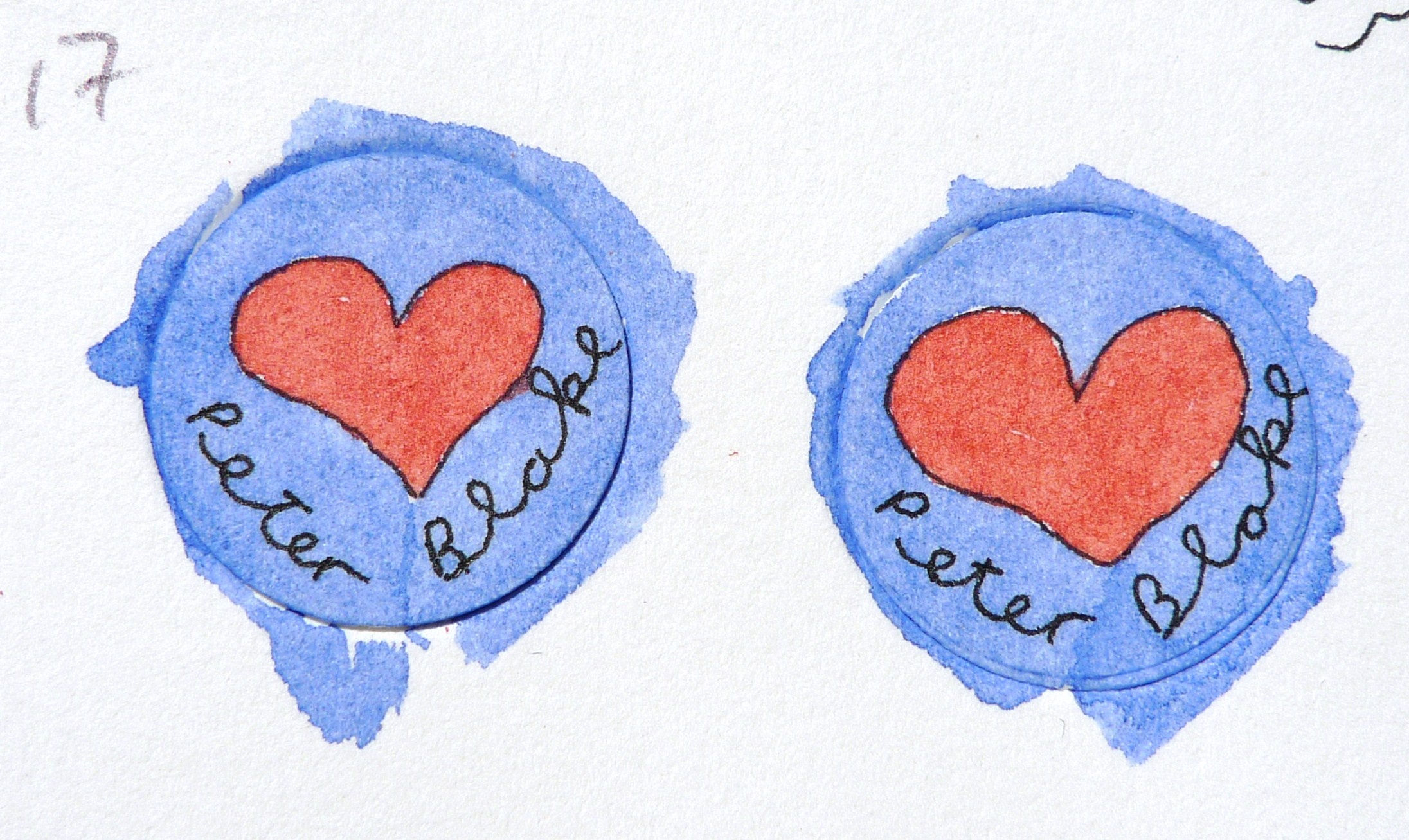 Blake agreed to revamp the cufflinks and make them his own. Working with the Louisa Guinness Gallery, the smallest ready-made glass watch face available was found. Circles this size were drawn out on a piece of paper and given to the artist. Blake painted hearts, targets and stars inside, and created a few tiny collages that were then set behind the glass face. A cufflink matching the design of the Elvis piece was made, although the battered sliver was replaced with 18ct gold. The swivelling bar at the back of the cufflink was replaced with a tiny gold spoon inspired by a large-scale piece Blake was working on at the time. Each watercolour was signed, and each was unique.