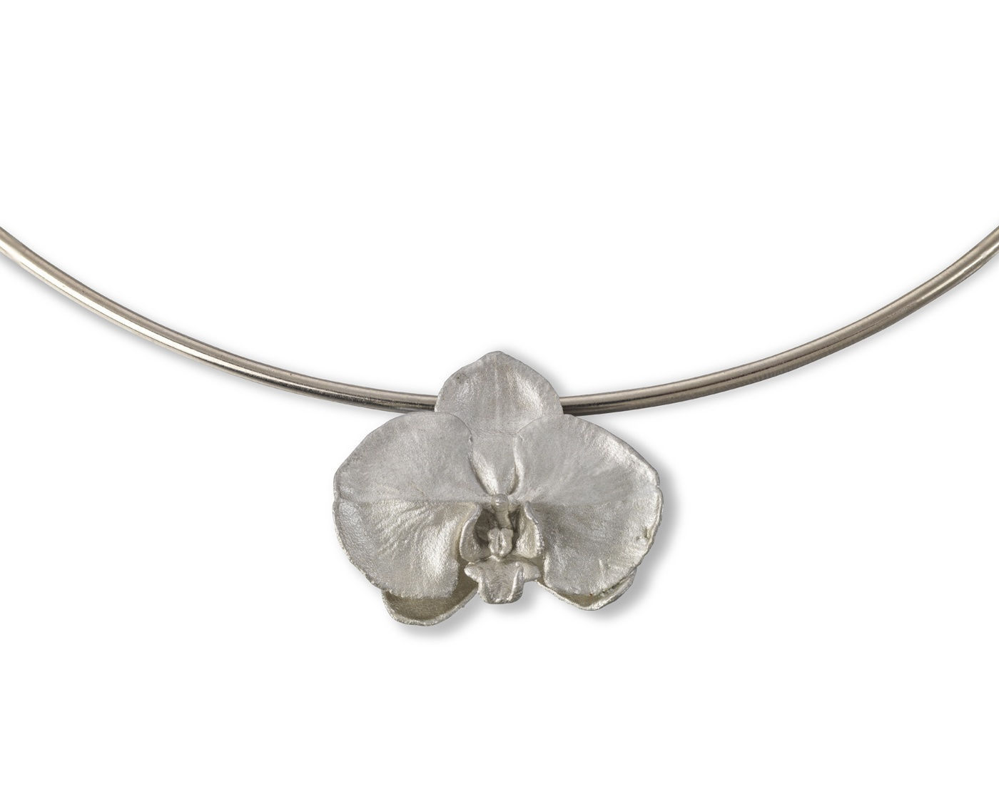Orchid Pendant & Choker, 2018, silver pendant with silver choker; signed ‘M.Q’ and marked ‘unique’ on reverse; 2.5 x 3.0 x 0.85 cm; 5 grams; unique.