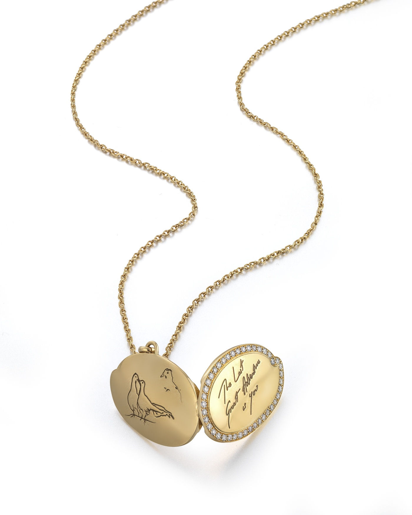 'The Last Great Adventure is You' Locket, 2018, 18k yellow gold (16.12 grams) with white diamond pave (41pcs/0.41cts) & 18k gold chain; signed ‘SW’ & ‘TE’ on interior of locket; 1.7 x 2.6 x 0.45 cm; 16.2 grams; unique.