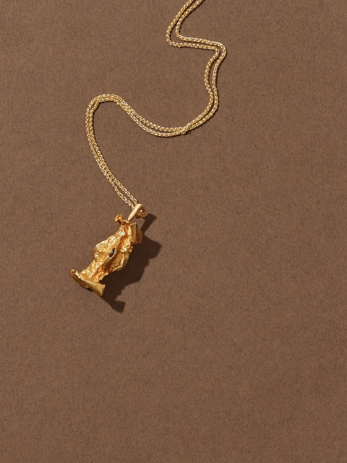Gavin Turk, Ten Commandments, Apple Core (Fixed Stalk), 2014, 18k gold, garnet pip, suspensory loop on stalk with gold chain and leather case. Incised with the artist's signature, numbered & hallmarked; 4.8 x 1.6 x 1.7 cm; Chain length: 60 cm; 30 g. Edition of 8 + 2 AP in collaboration with Louisa Guinness.