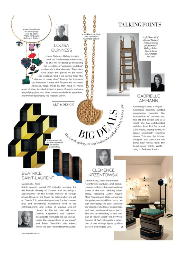 Look out for Guinness at her stand, as she will no doubt be modelling the jewellery, or 'wearable sculpture' as she calls it, that she sells. 'The artists have made the pieces to be worn,' she explains, 'and I like giving them the chnace to come alive.' Among the treasures by Alexander Calder and Picasso will be a new necklace, 'Naja', made by Ron Arad, in which a rod of silver coiled around a piece of quartz cut as a magnifying glass, and silver horse's heads (both a pendant, and mini sculpture) by Nic Fiddian-Green.